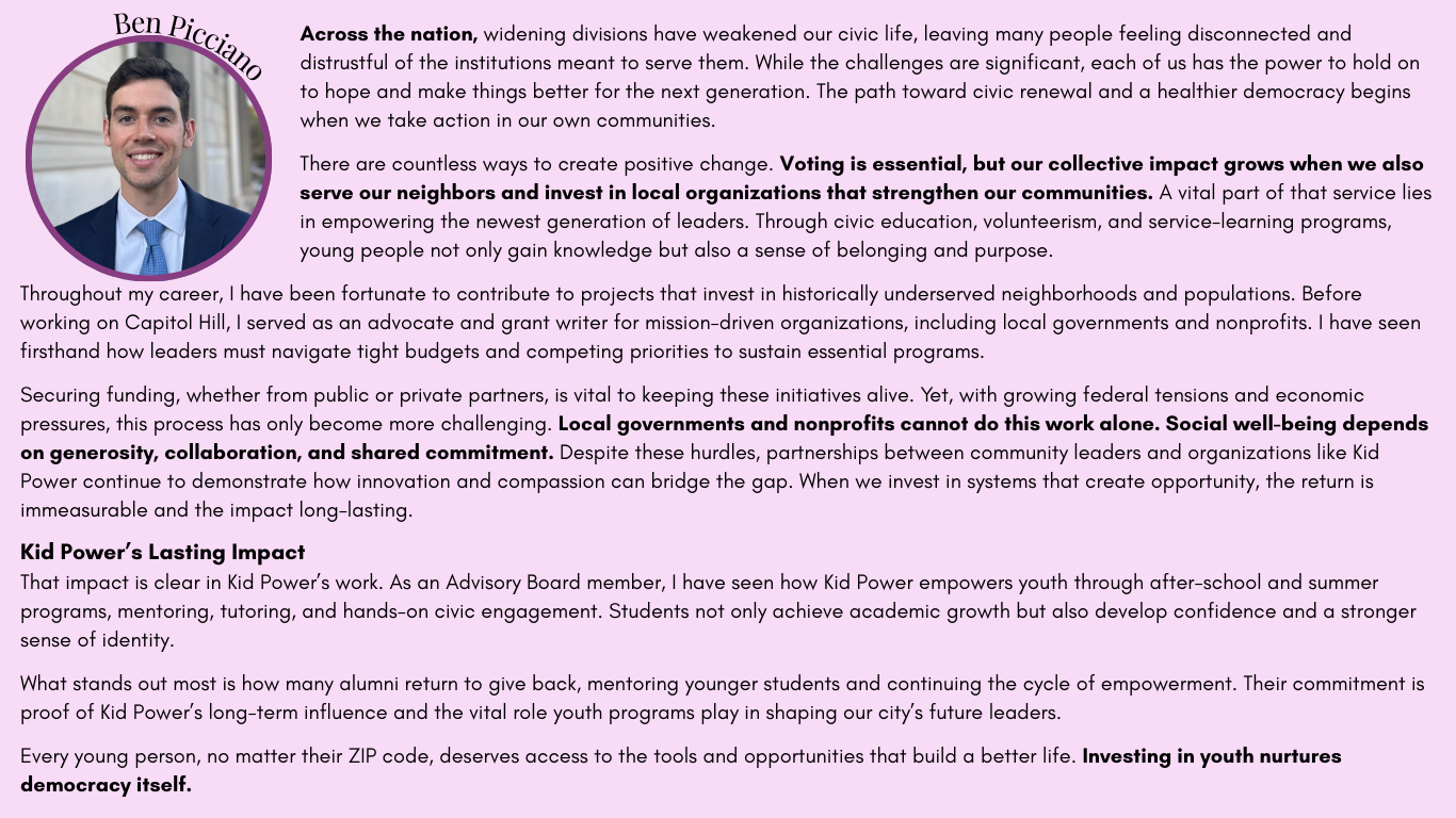 In times of uncertainty, taking action is one of the most powerful things we can do. Kid Power’s Advisory Board Member and Legislative Assistant in the U.S. House of Representatives, Ben Picciano, shares his personal reflection on how civic engagement and education can transform uncertainty into action and how programs like Kid Power inspire that transformation every day.