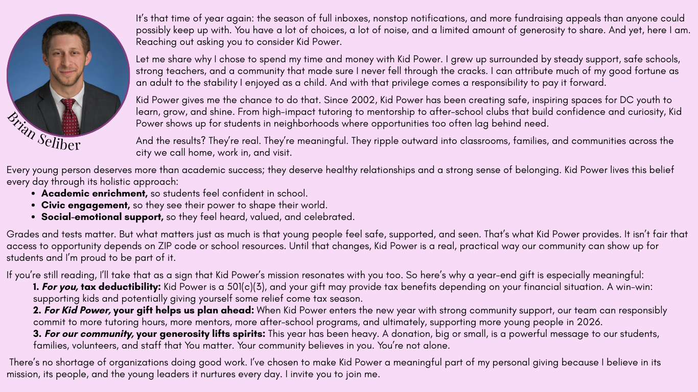 Raj’s reflections remind us that giving and storytelling go hand in hand. Your donation sustains Kid Power. Your voice amplifies it.